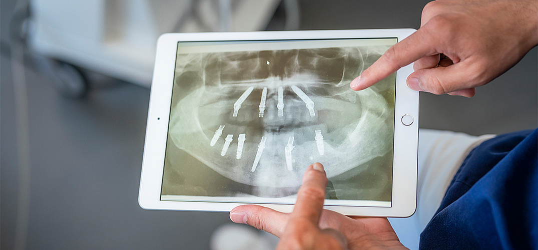 In manchen Fällen reicht der eigene Knochen nicht aus, um ein Implantat langfristig stabil im Knochen verankern zu können. Dies kann z. B. der Fall sein, wenn Zähne bereits länger fehlen und sich der Knochen deshalb abgebaut hat oder nach vorausgegangener Parodontitis. Ob und in welchem Ausmaß ein Knochenaufbau notwendig ist, kann meist erst nach einer 3D-Aufnahme (DVT) präzise beurteilt werden. Im Zuge eines Knochenaufbaus wird das Volumen des Knochenlagers vergrößert. Hierbei kommen heutzutage verschiedene Techniken mit Eigenknochen und/oder Knochenersatzmaterialien zur Anwendung. Die verwendeten Knochenersatzmaterialien sind selbstverständlich allesamt CE-zertifiziert und müssen als Medizinprodukt zugelassen sein.