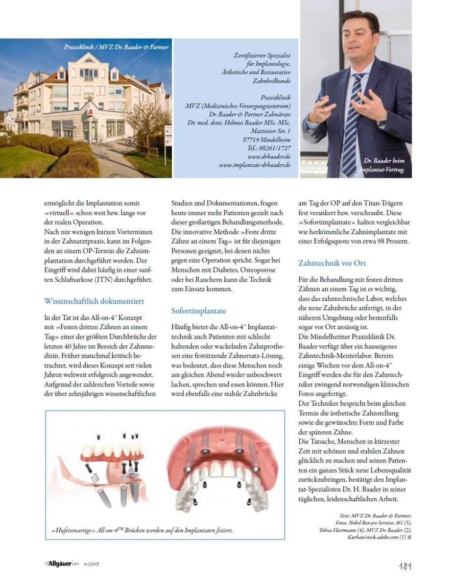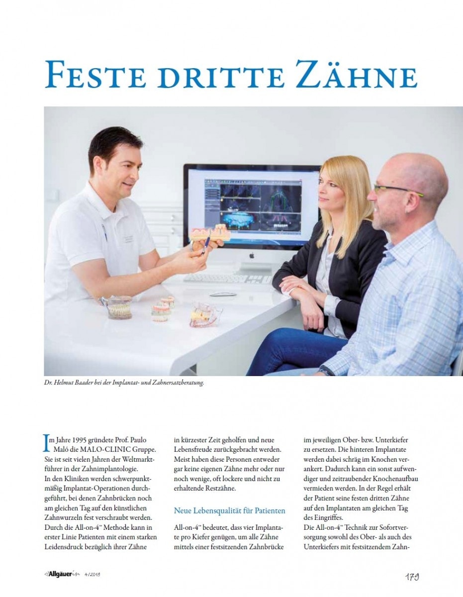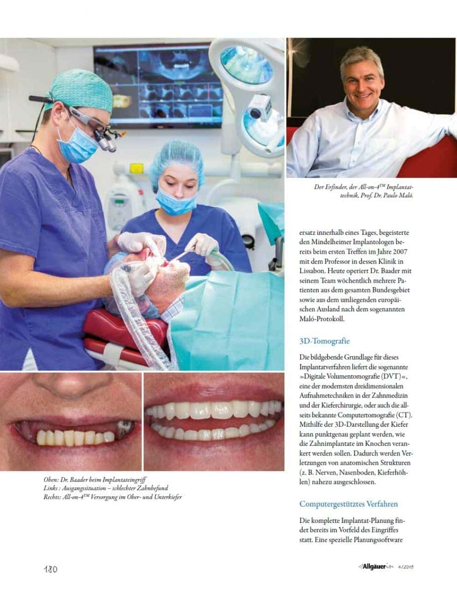 All-on-4™ bedeutet, dass vier Implantate pro Kiefer genügen, um alle Zähne mittels einer festsitzenden Zahnbrücke im jeweiligen Ober- bzw. Unterkiefer zu ersetzen. Die hinteren Implantate werden dabei schräg im Knochen verankert. Dadurch kann ein sonst aufwendiger und zeitraubender Knochenaufbau vermieden werden. In der Regel erhält der Patient seine festen dritten Zähne auf den Implantaten am gleichen Tag des Eingriffes. Die All-on-4™ Technik zur Sofortversorgung sowohl des Ober- als auch des Unterkiefers mit festsitzendem Zahnersatz innerhalb eines Tages, begeisterte den Mindelheimer Implantologen bereits beim ersten Treffen im Jahre 2007 mit dem Professor in dessen Klinik in Lissabon. Heute operiert Dr. Baader mit seinem Team wöchentlich mehrere Patienten aus dem gesamten Bundesgebiet sowie aus dem umliegenden europäischen Ausland nach dem sogenannten Maló-Protokoll.