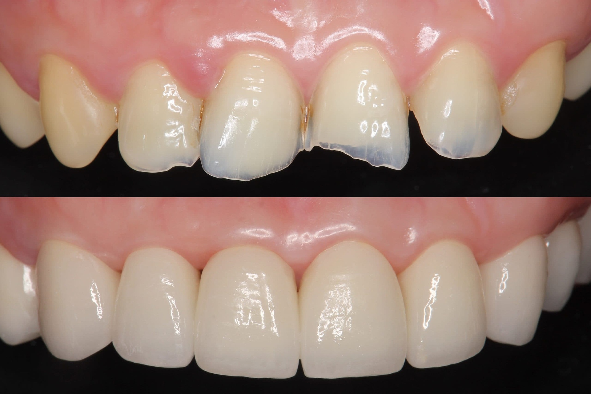 In der Zahnarztpraxis wird die nahezu transparente Verblendschale durch eine besondere Klebetechnik fest mit der Zahnfront verbunden. Dieser Prozess ist zahnärztlich äußerst anspruchsvoll, aber überwiegend schmerzfrei.